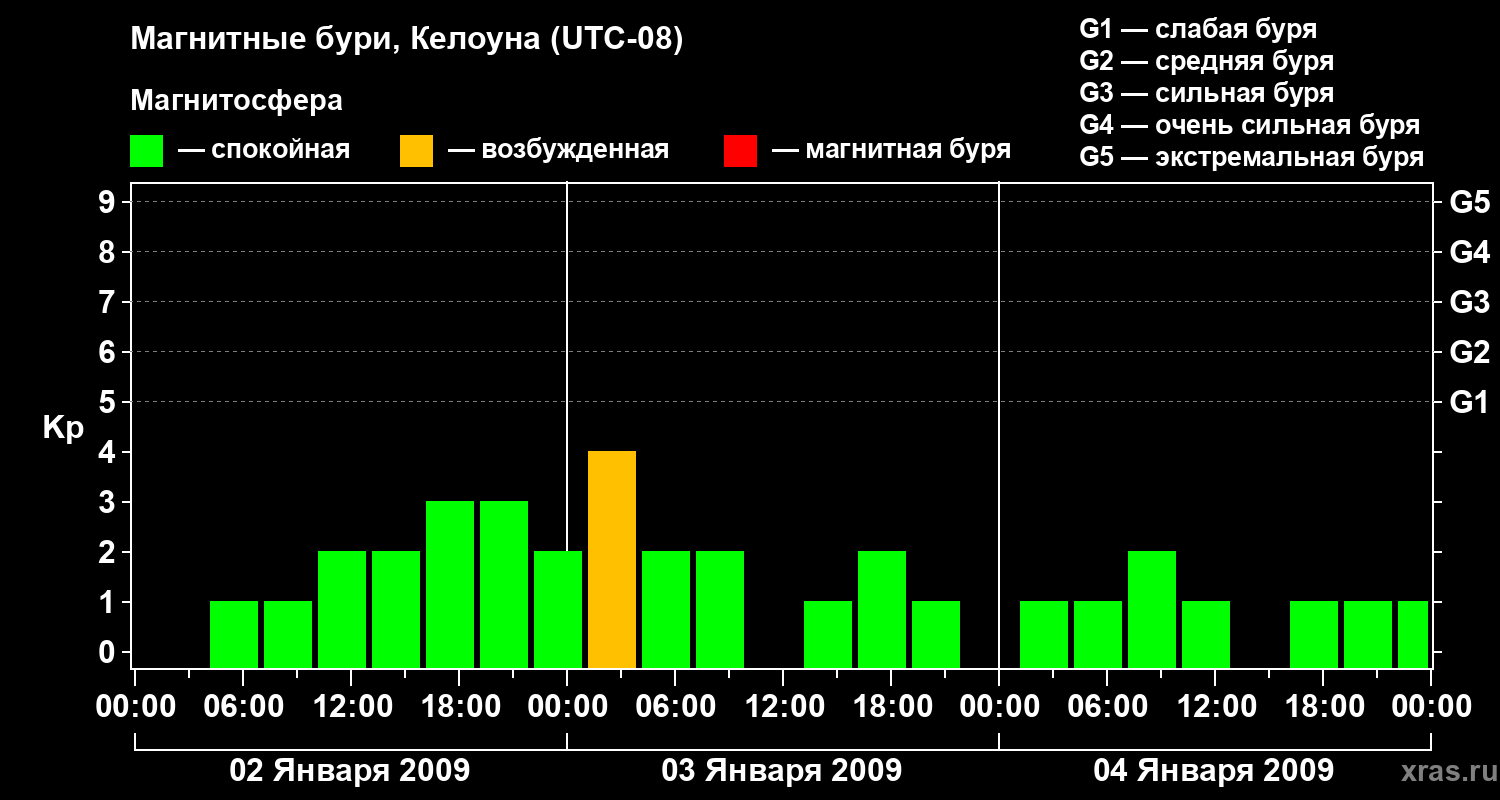 Изменения геомагнитного индекса Kp с 2 по 4 января 2009 года для средних широт