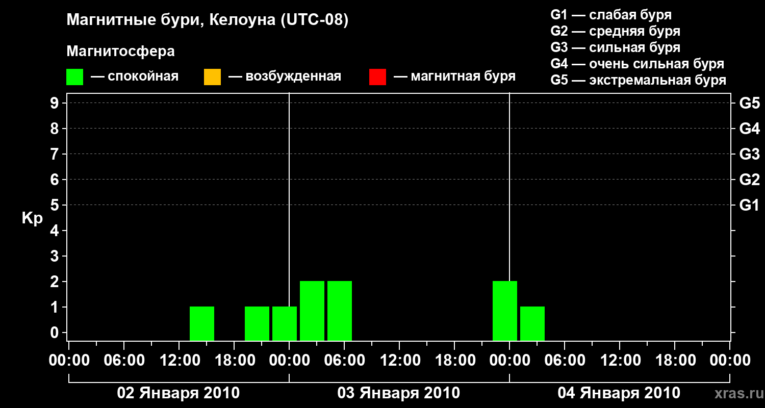 Изменения геомагнитного индекса Kp с 2 по 4 января 2010 года для средних широт