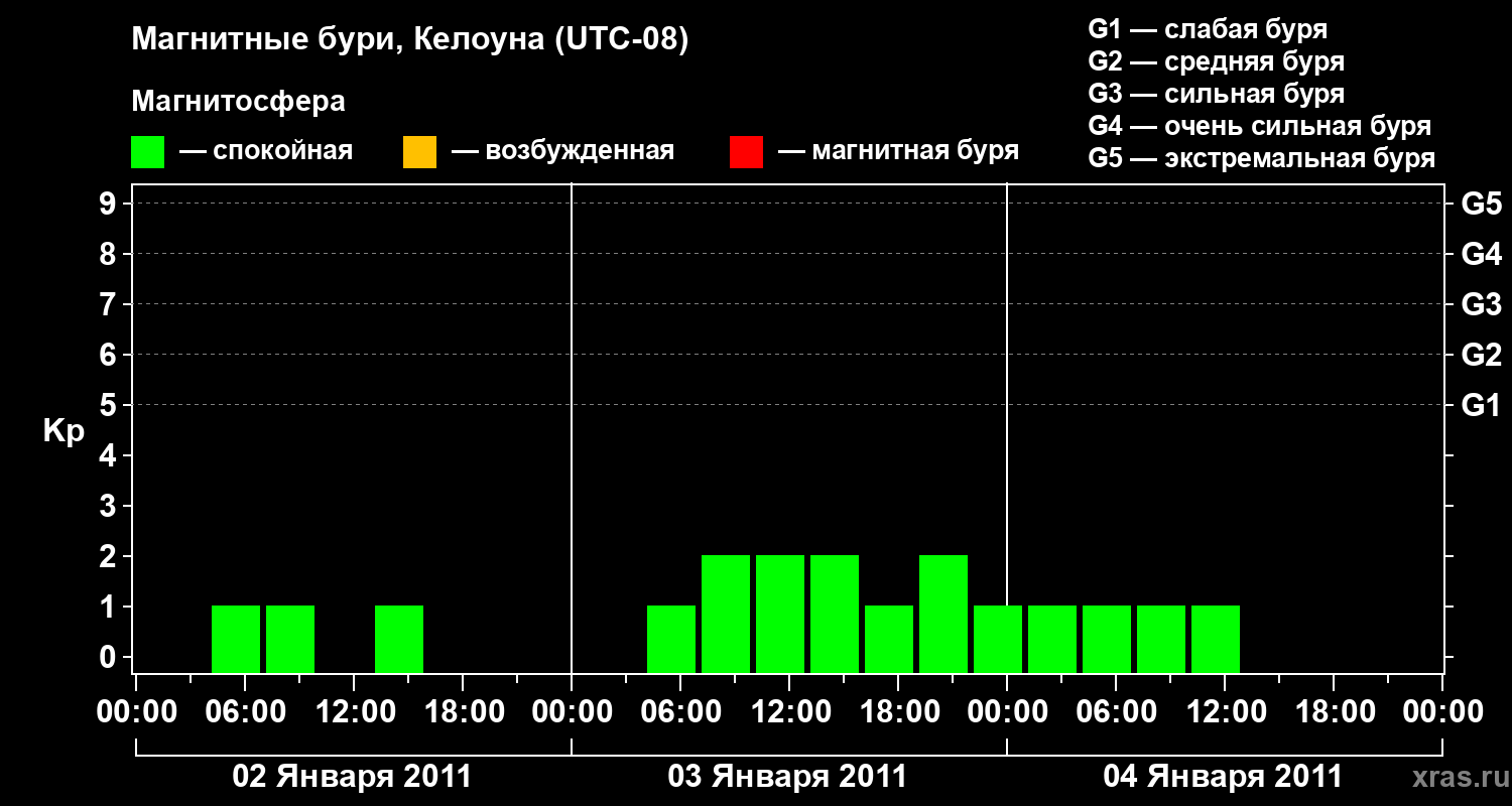 Изменения геомагнитного индекса Kp с 2 по 4 января 2011 года для средних широт