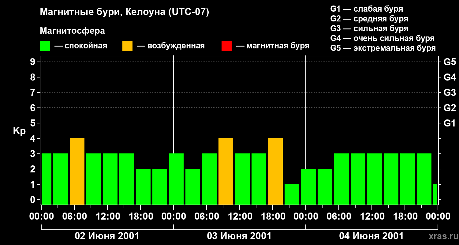 Изменения геомагнитного индекса Kp с 2 по 4 июня 2001 года для средних широт