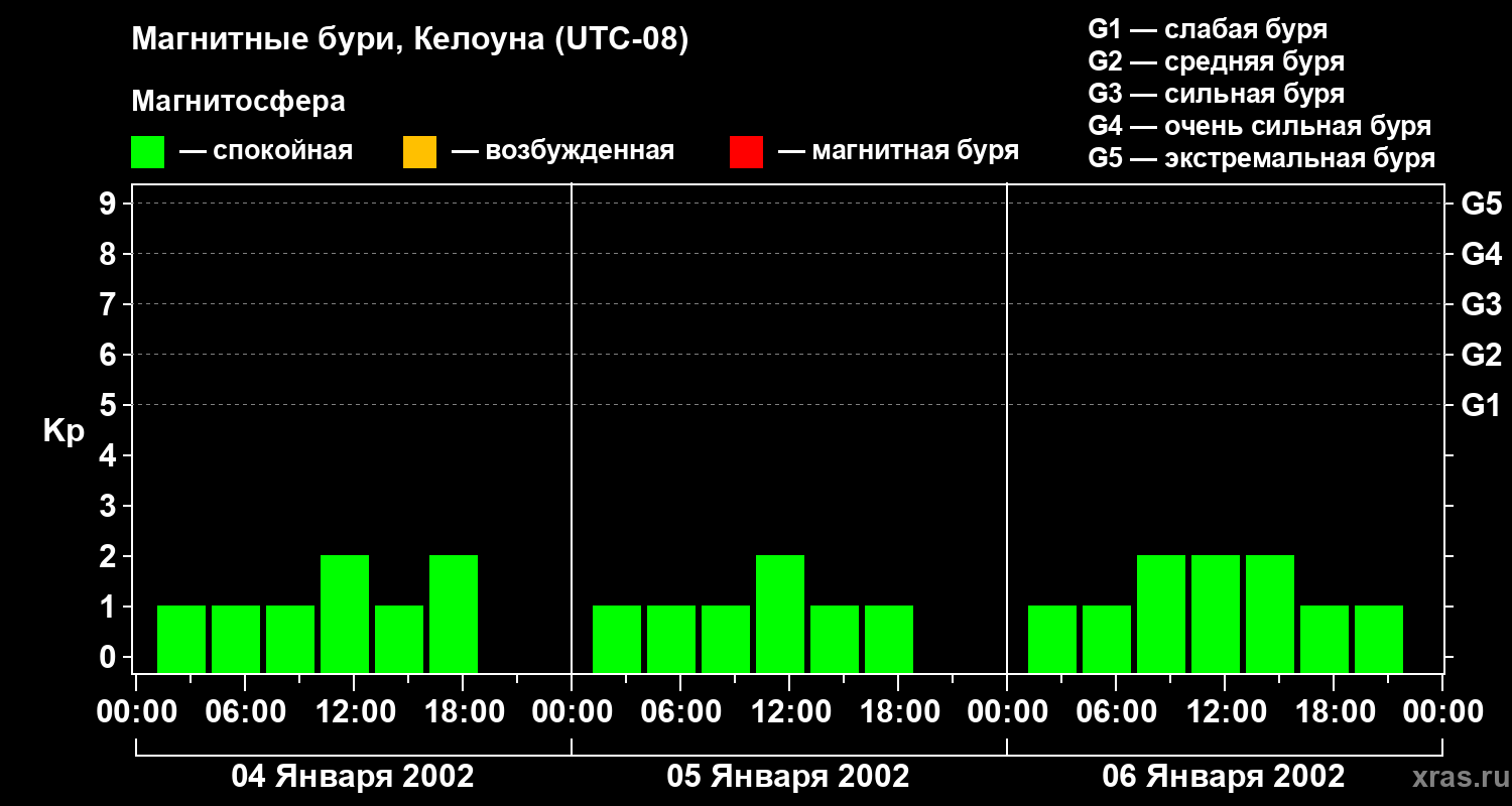 Изменения геомагнитного индекса Kp с 4 по 6 января 2002 года для средних широт