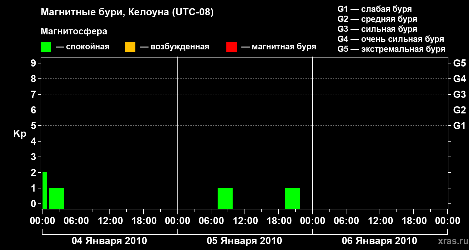 Изменения геомагнитного индекса Kp с 4 по 6 января 2010 года для средних широт