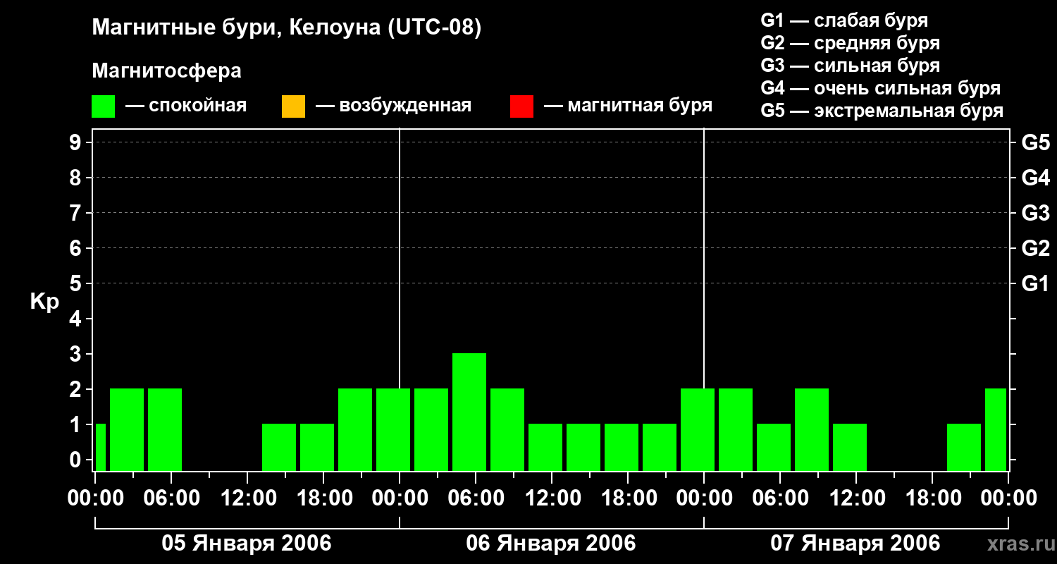 Изменения геомагнитного индекса Kp с 5 по 7 января 2006 года для средних широт
