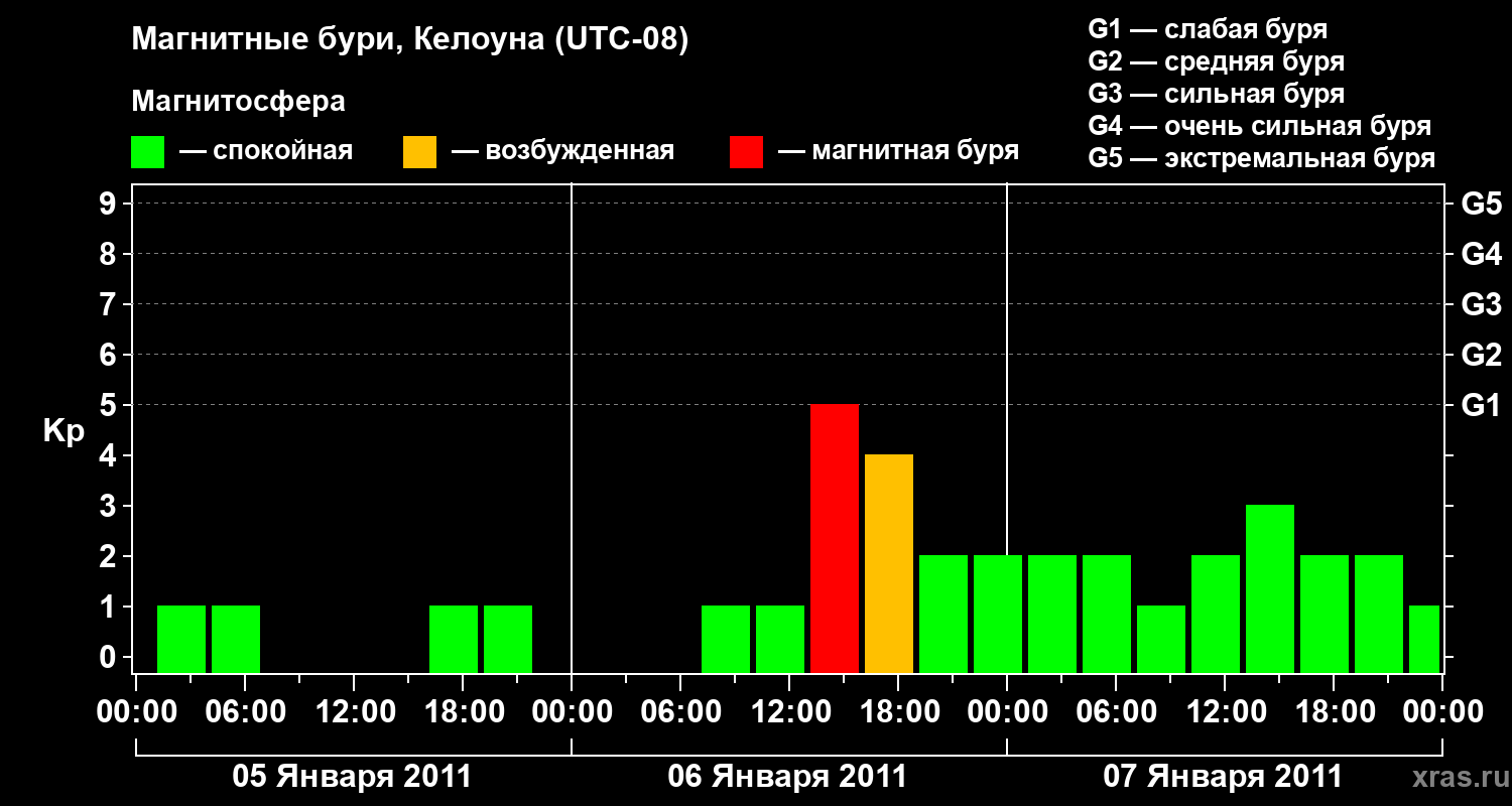 Изменения геомагнитного индекса Kp с 5 по 7 января 2011 года для средних широт