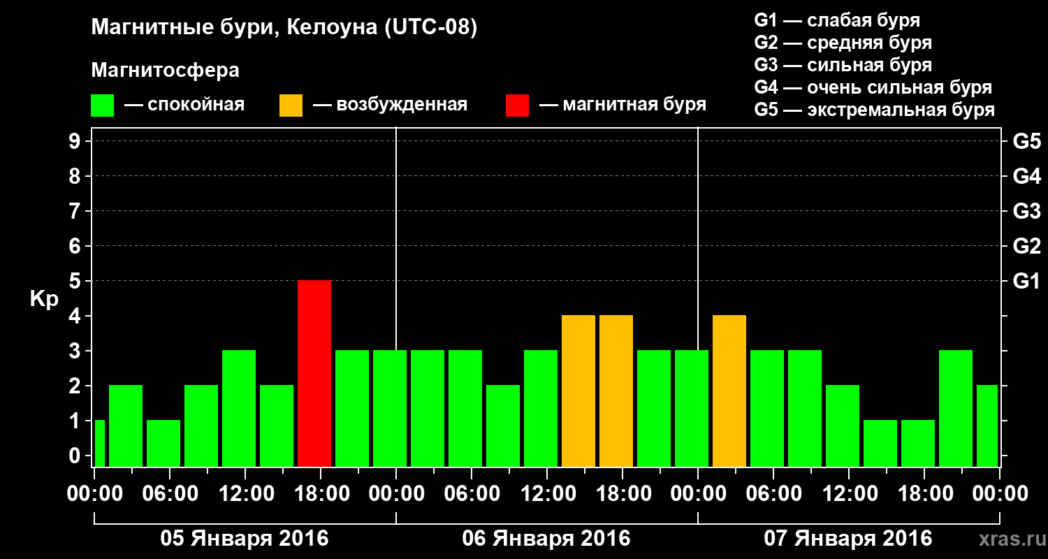 Изменения геомагнитного индекса Kp с 5 по 7 января 2016 года для средних широт