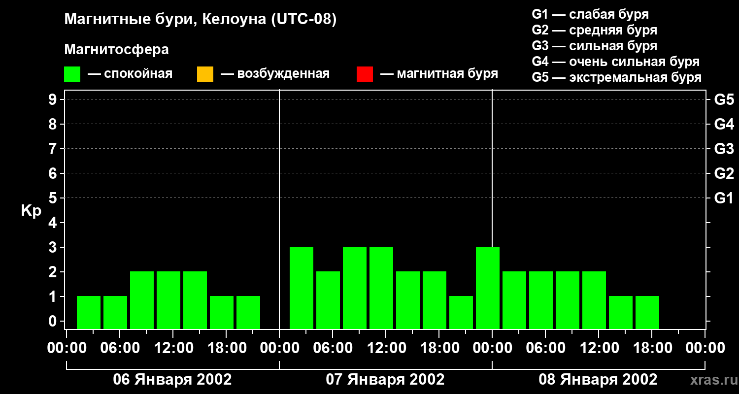 Изменения геомагнитного индекса Kp с 6 по 8 января 2002 года для средних широт