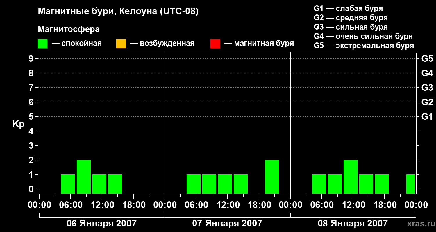 Изменения геомагнитного индекса Kp с 6 по 8 января 2007 года для средних широт