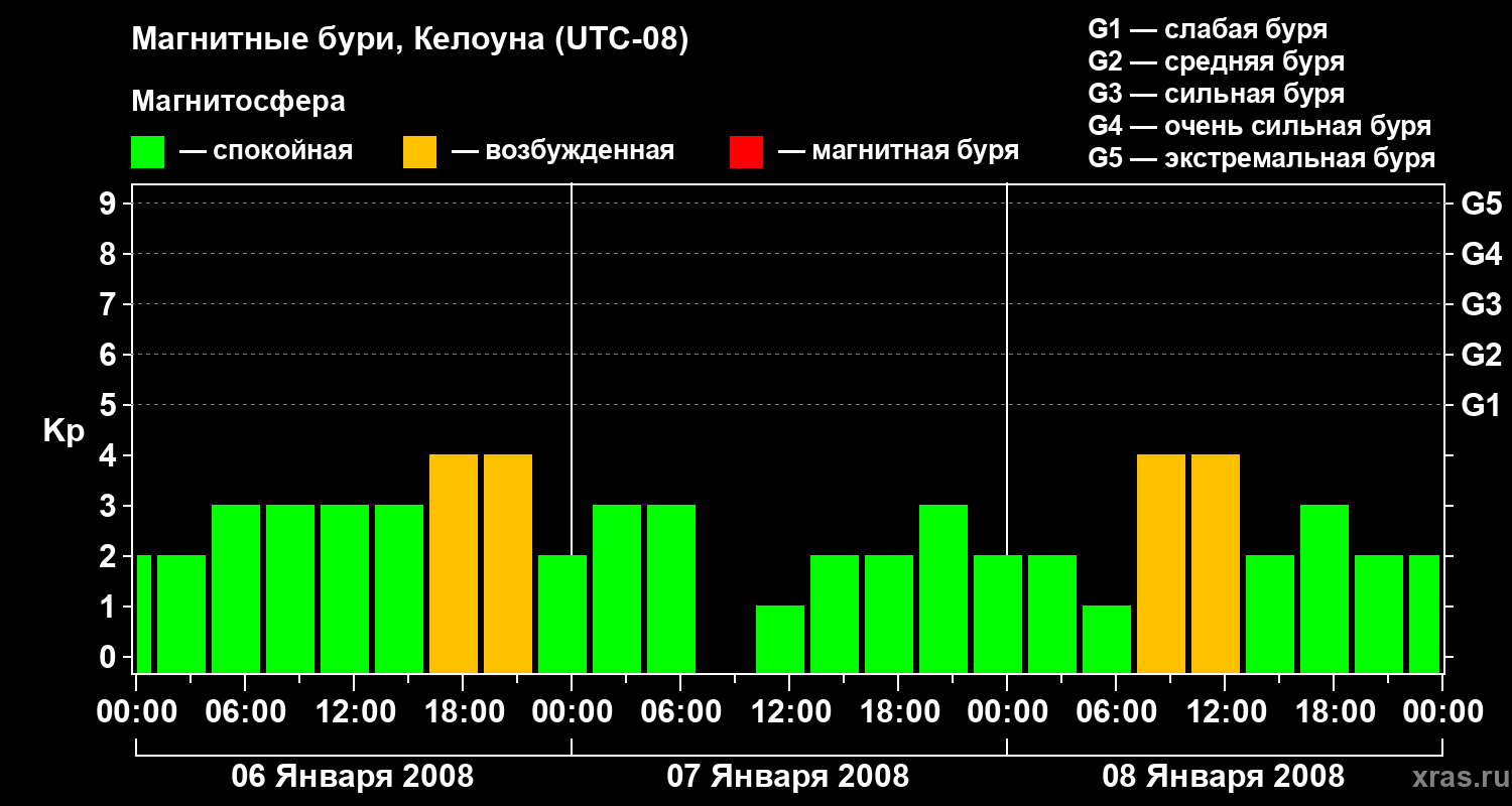 Изменения геомагнитного индекса Kp с 6 по 8 января 2008 года для средних широт