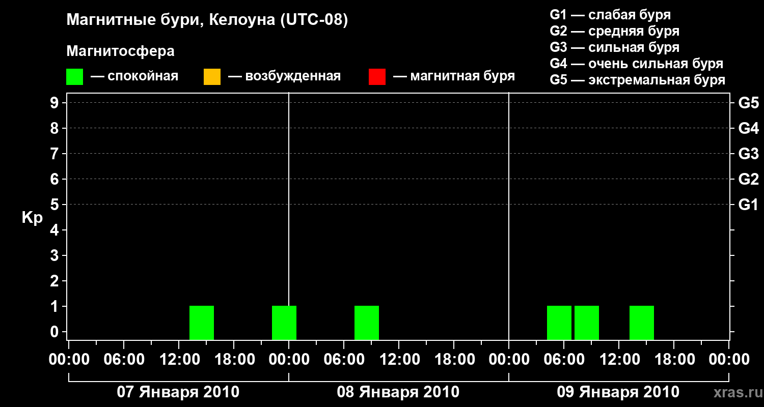 Изменения геомагнитного индекса Kp с 7 по 9 января 2010 года для средних широт