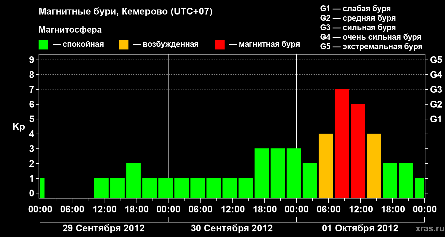 Изменения геомагнитного индекса Kp с 29 сентября по 1 октября 2012 года для средних широт