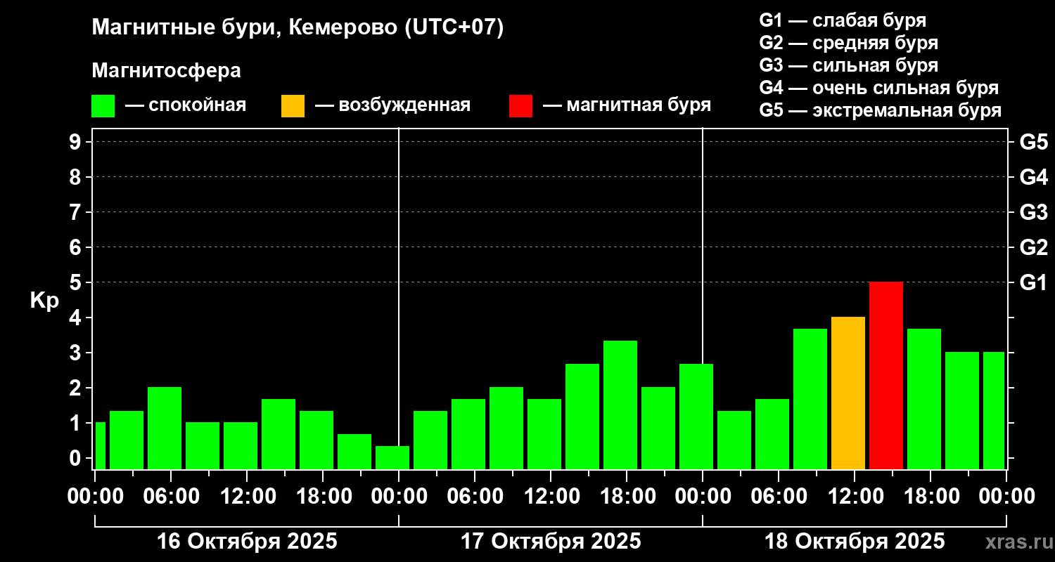 Изменения геомагнитного индекса Kp с 16 по 18 октября 2025 года для средних широт