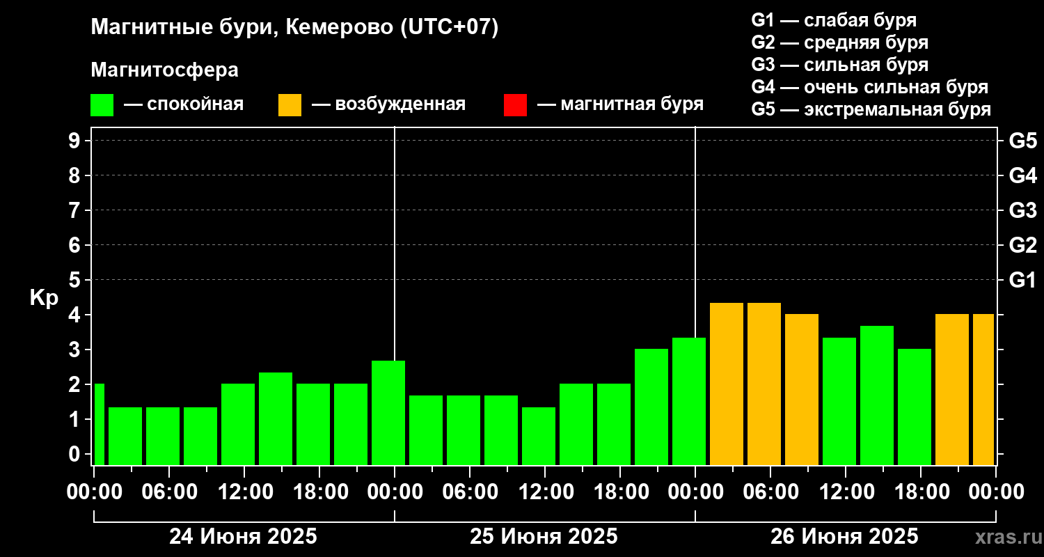 Изменения геомагнитного индекса Kp с 24 по 26 июня 2025 года для средних широт