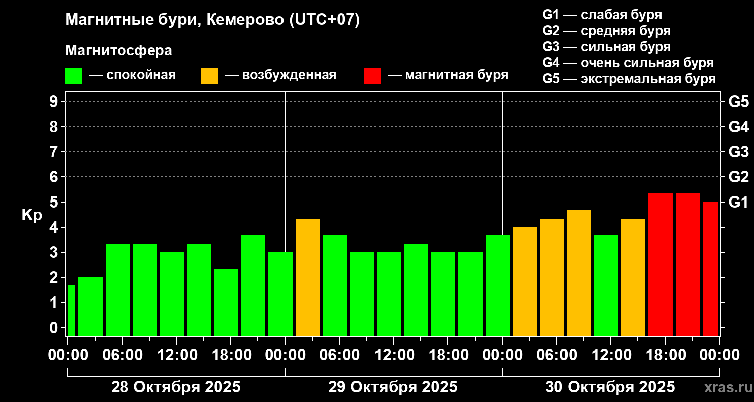 Изменения геомагнитного индекса Kp с 28 по 30 октября 2025 года для средних широт