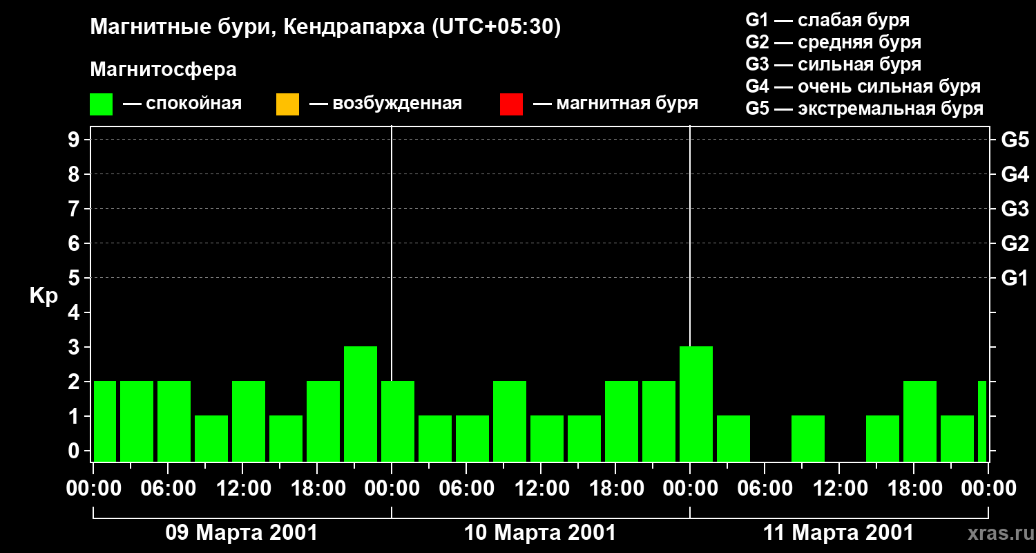 Изменения геомагнитного индекса Kp с 9 по 11 марта 2001 года для средних широт