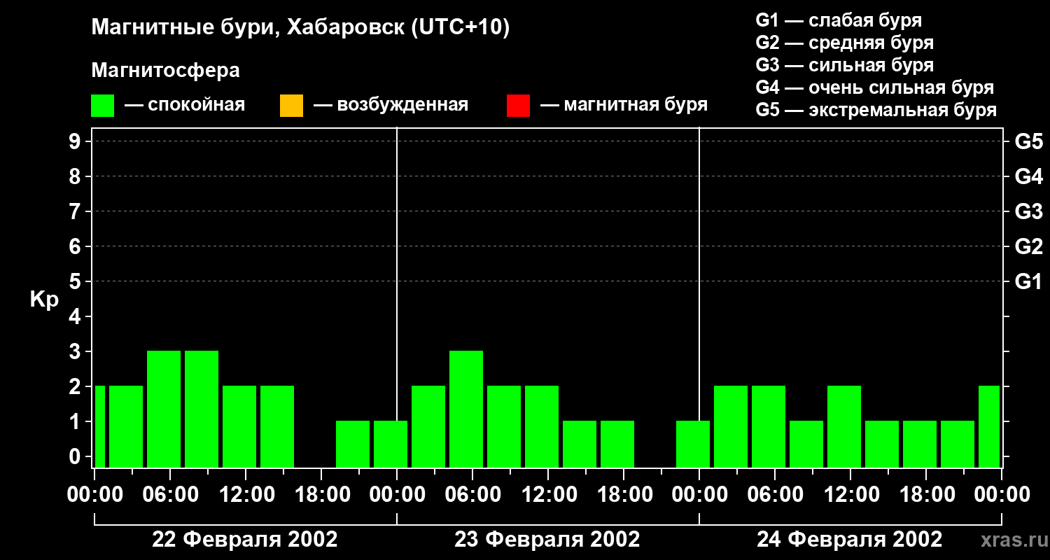 Изменения геомагнитного индекса Kp с 22 по 24 февраля 2002 года для средних широт