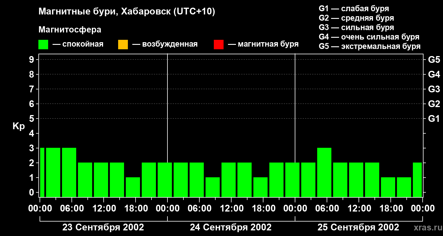Изменения геомагнитного индекса Kp с 23 по 25 сентября 2002 года для средних широт