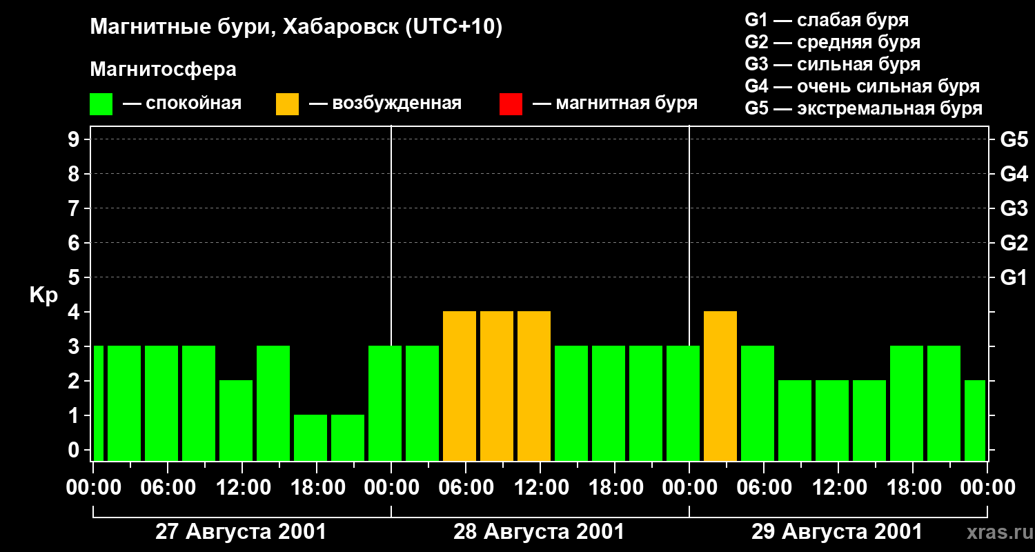 Изменения геомагнитного индекса Kp с 27 по 29 августа 2001 года для средних широт