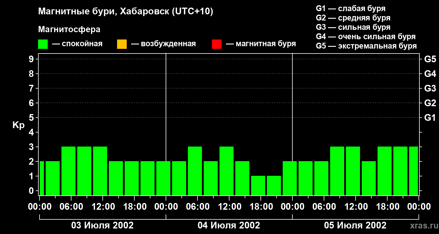 Изменения геомагнитного индекса Kp с 3 по 5 июля 2002 года для средних широт