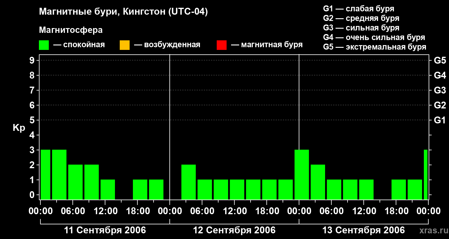 Изменения геомагнитного индекса Kp с 11 по 13 сентября 2006 года для средних широт