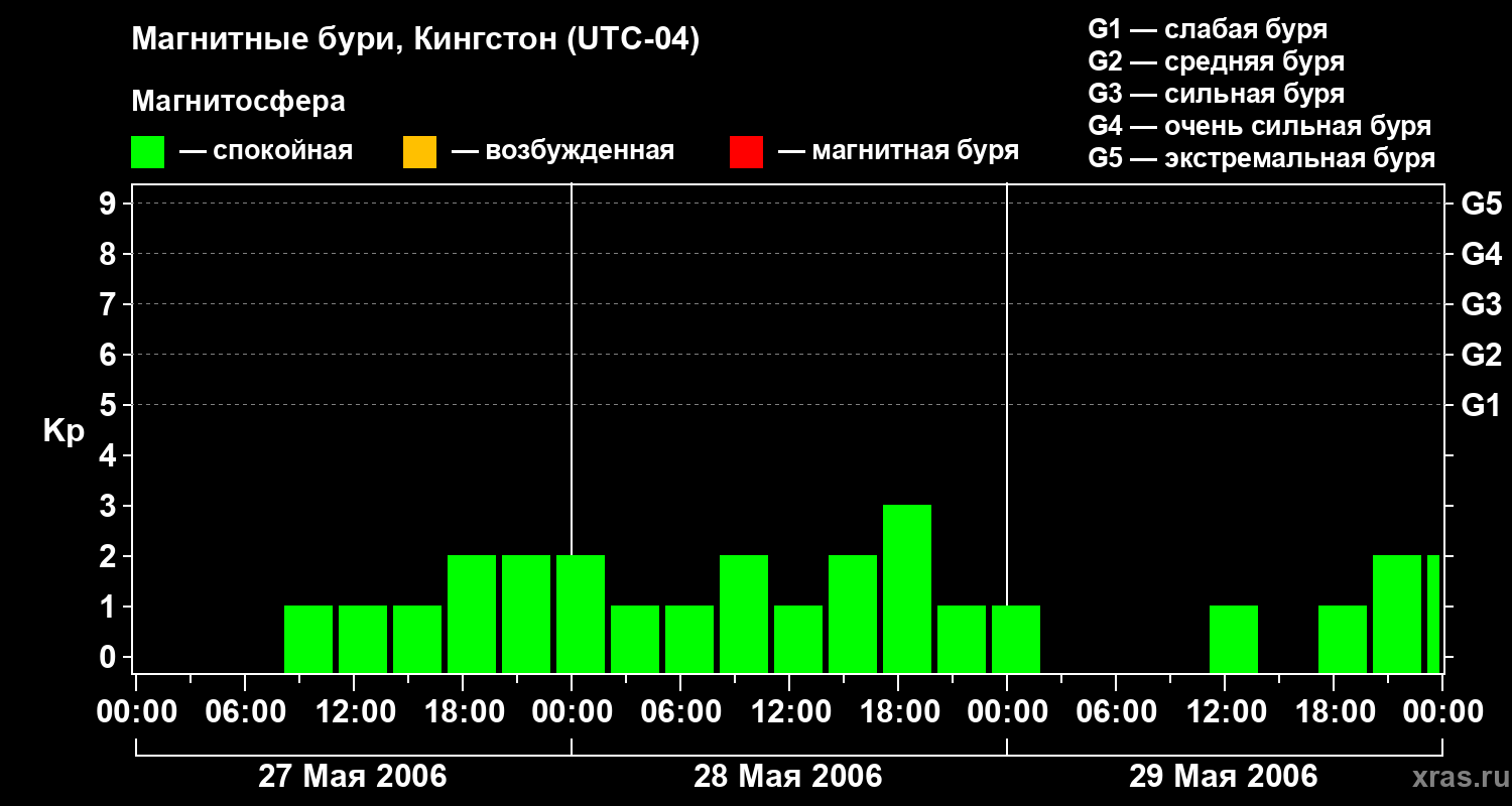 Изменения геомагнитного индекса Kp с 27 по 29 мая 2006 года для средних широт