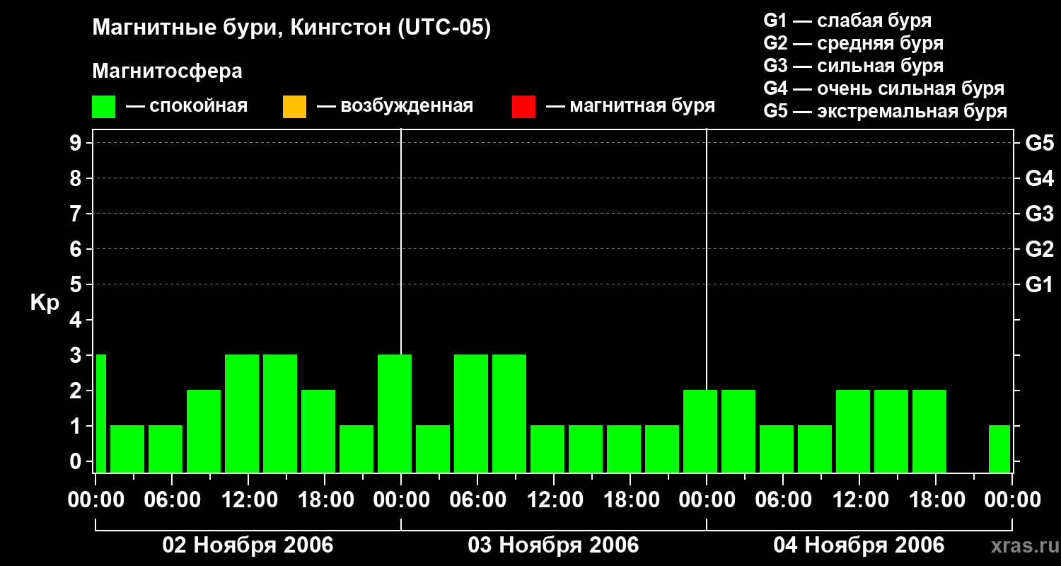 Изменения геомагнитного индекса Kp с 2 по 4 ноября 2006 года для средних широт