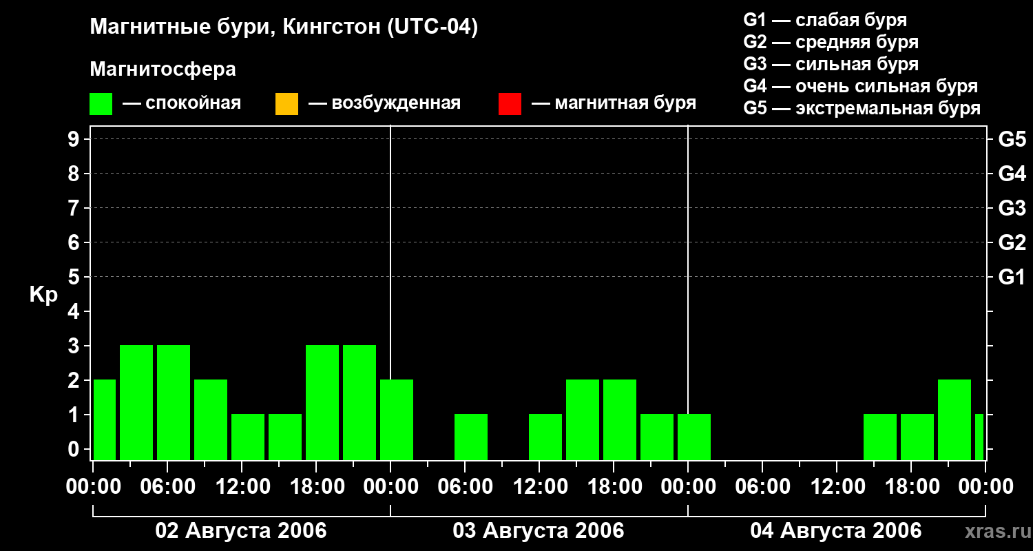Изменения геомагнитного индекса Kp с 2 по 4 августа 2006 года для средних широт