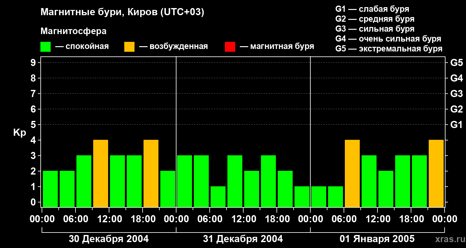 Изменения геомагнитного индекса Kp с 30 декабря 2004 года по 1 января 2005 года для средних широт