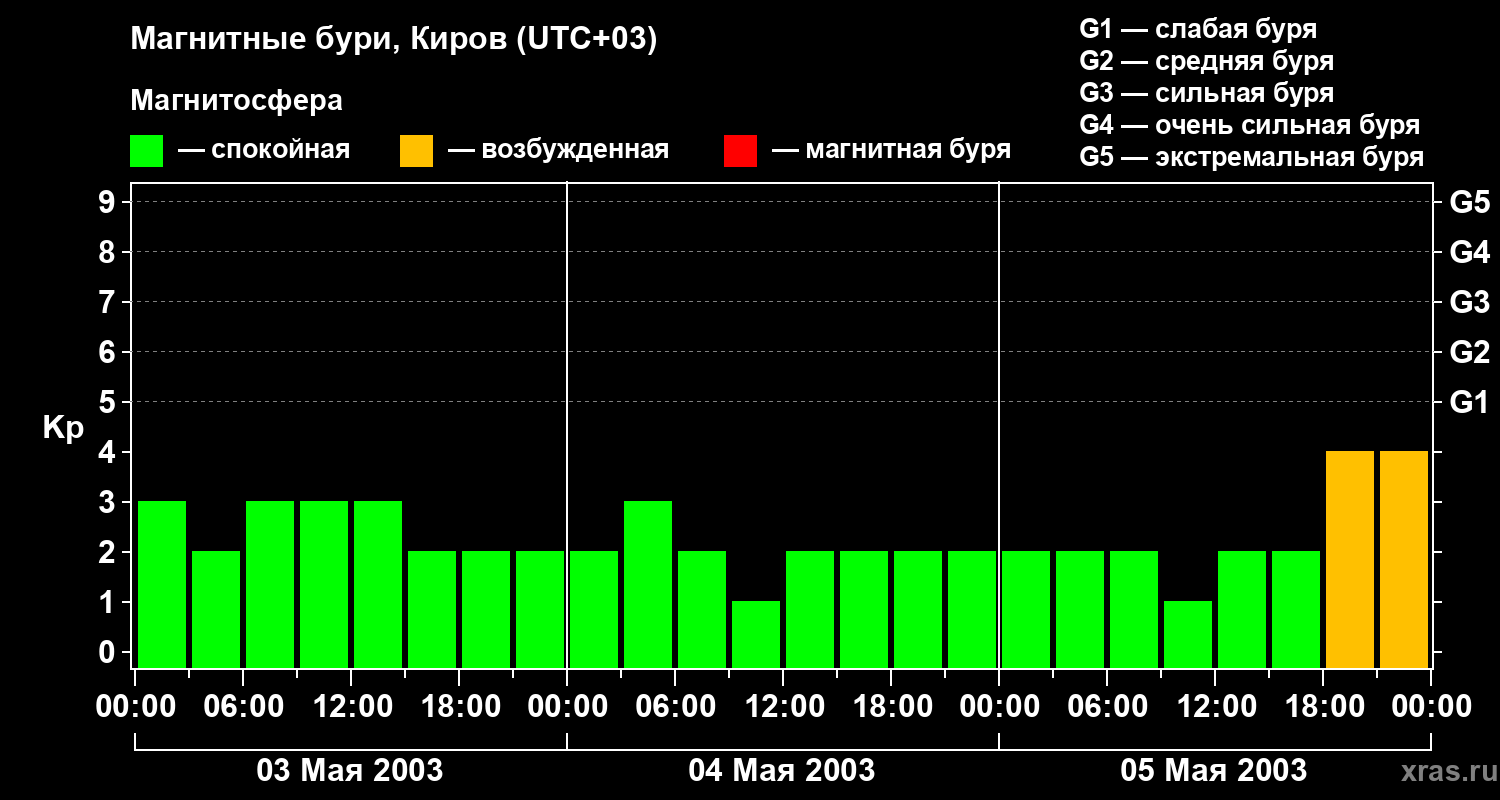 Изменения геомагнитного индекса Kp с 3 по 5 мая 2003 года для средних широт