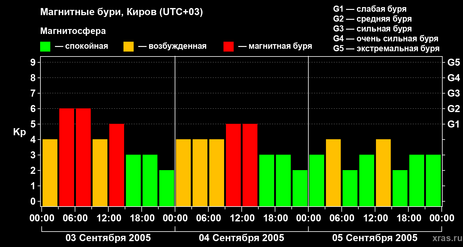 Изменения геомагнитного индекса Kp с 3 по 5 сентября 2005 года для средних широт