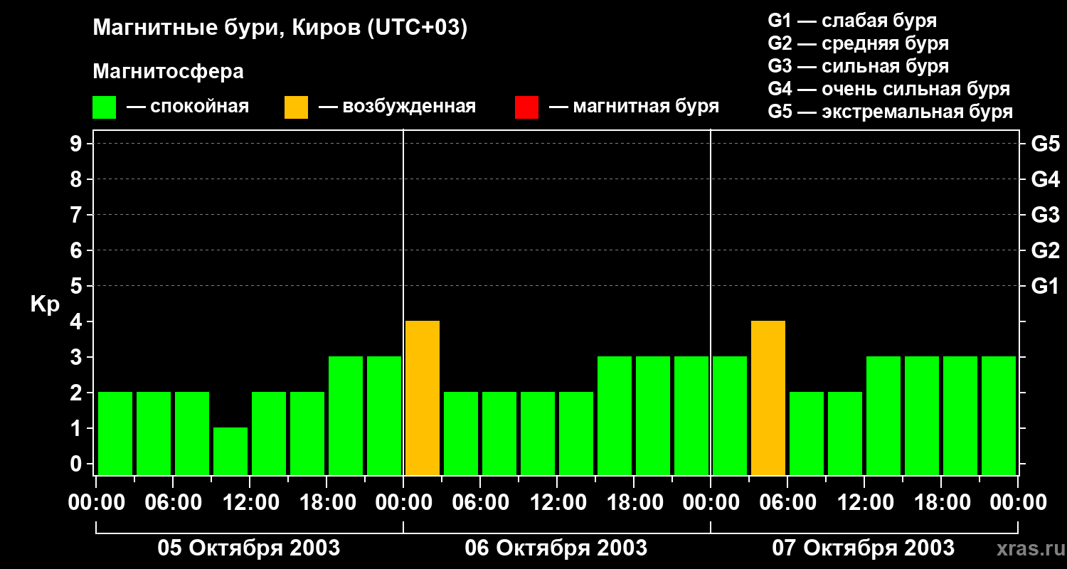 Изменения геомагнитного индекса Kp с 5 по 7 октября 2003 года для средних широт