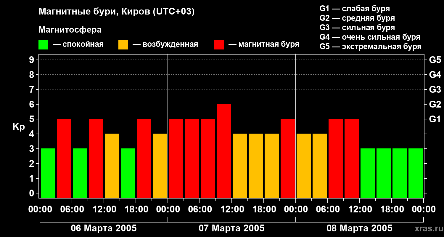 Изменения геомагнитного индекса Kp с 6 по 8 марта 2005 года для средних широт