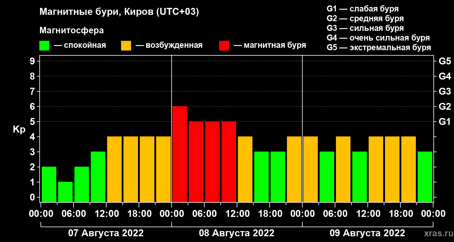Изменения геомагнитного индекса Kp с 7 по 9 августа 2022 года для средних широт