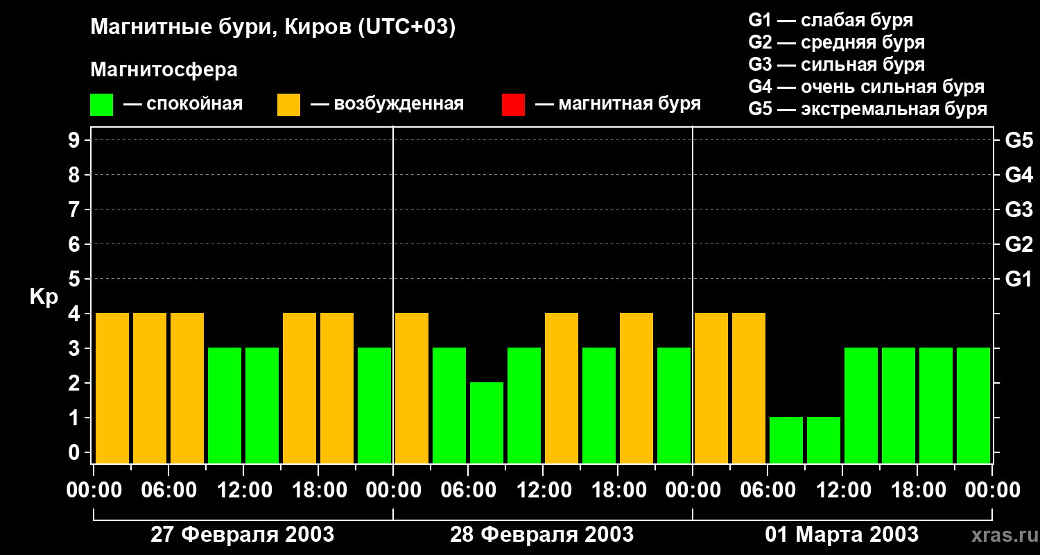 Изменения геомагнитного индекса Kp с 27 февраля по 1 марта 2003 года для средних широт
