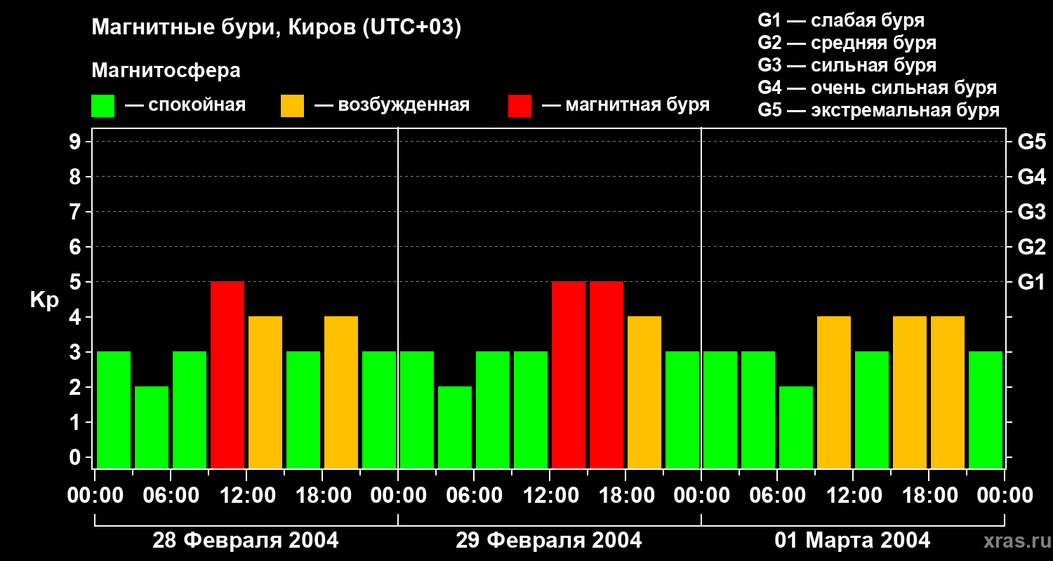 Изменения геомагнитного индекса Kp с 28 февраля по 1 марта 2004 года для средних широт