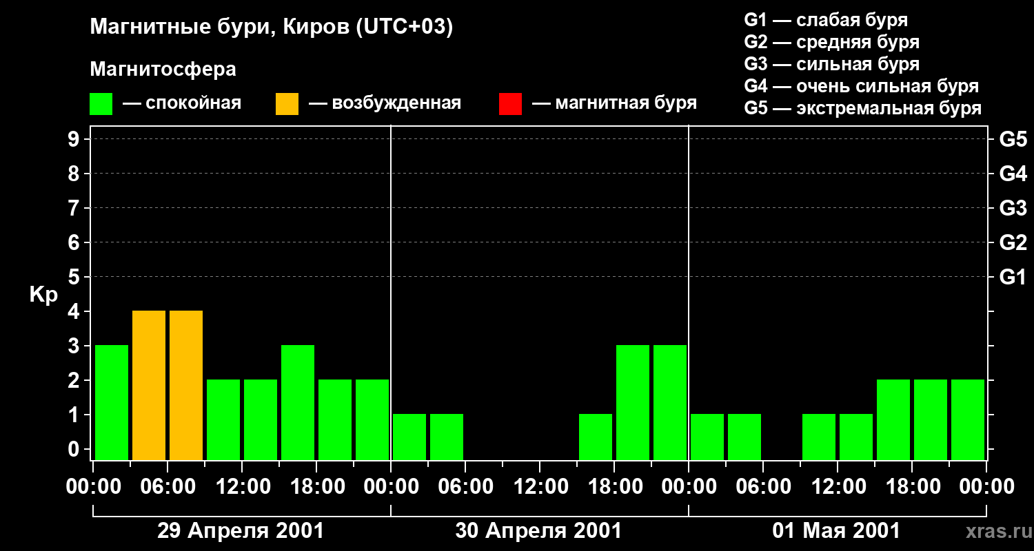 Изменения геомагнитного индекса Kp с 29 апреля по 1 мая 2001 года для средних широт