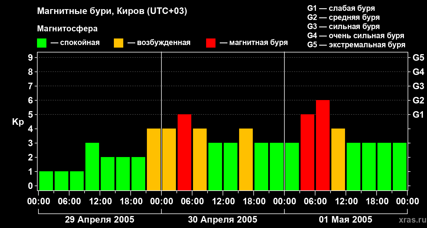 Изменения геомагнитного индекса Kp с 29 апреля по 1 мая 2005 года для средних широт