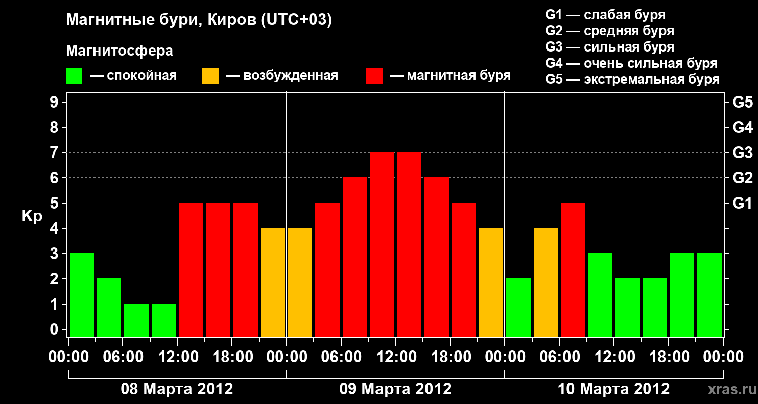 Изменения геомагнитного индекса Kp с 8 по 10 марта 2012 года для средних широт