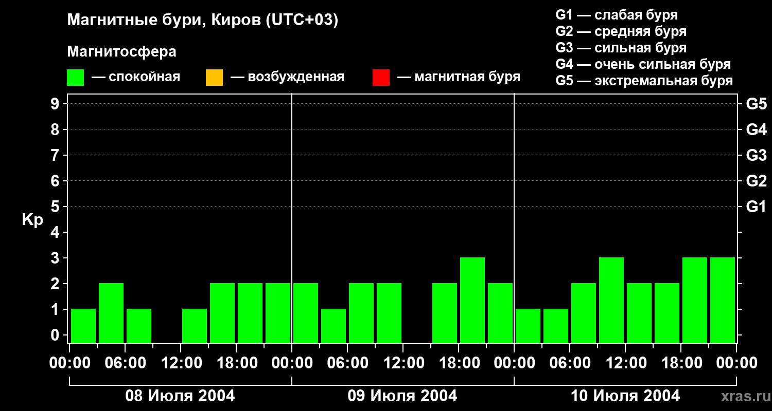 Изменения геомагнитного индекса Kp с 8 по 10 июля 2004 года для средних широт