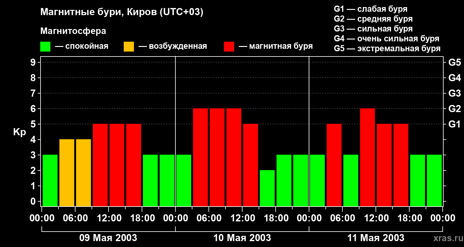 Изменения геомагнитного индекса Kp с 9 по 11 мая 2003 года для средних широт