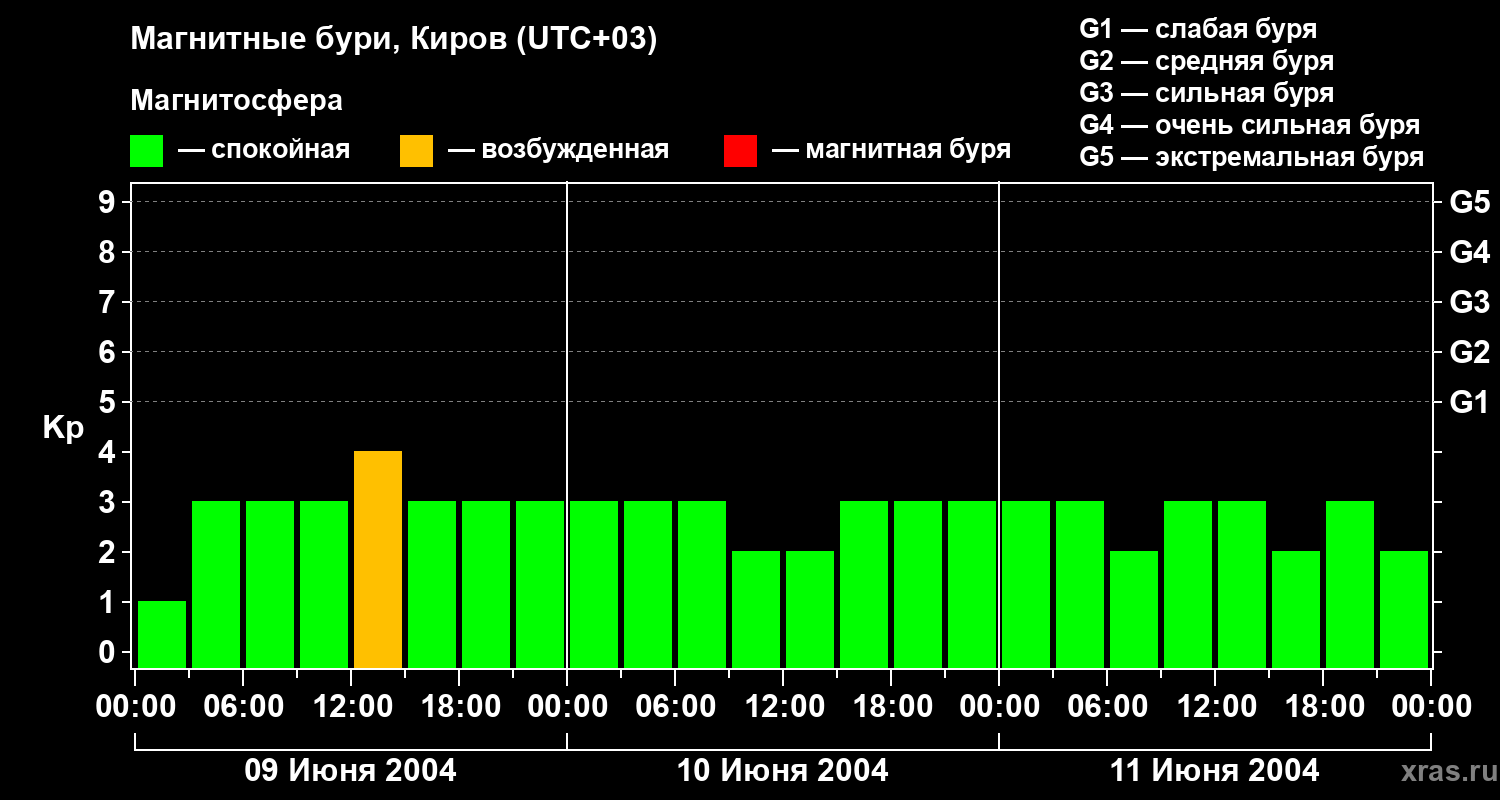 Изменения геомагнитного индекса Kp с 9 по 11 июня 2004 года для средних широт