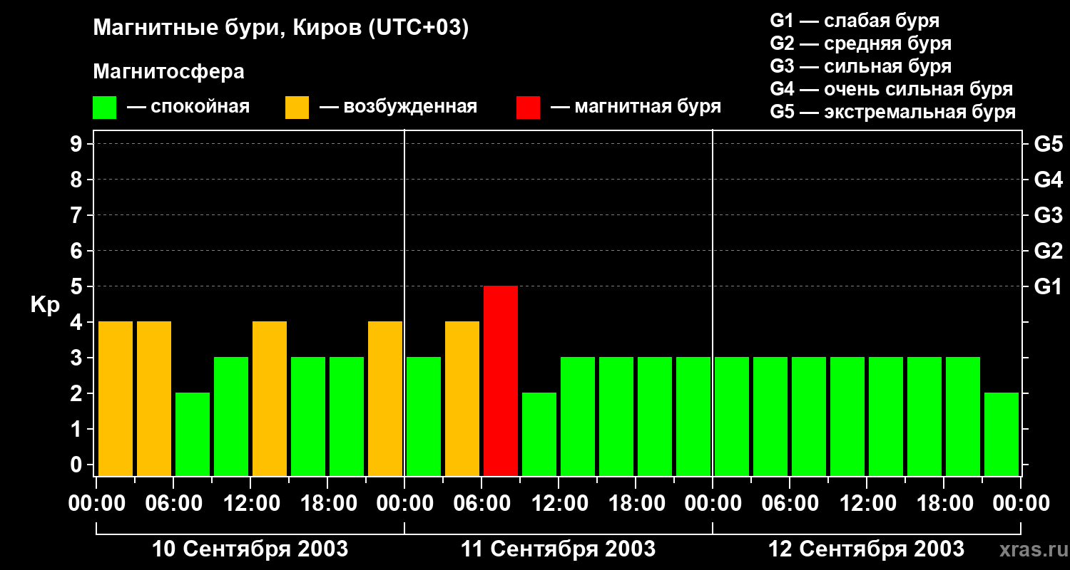 Изменения геомагнитного индекса Kp с 10 по 12 сентября 2003 года для средних широт