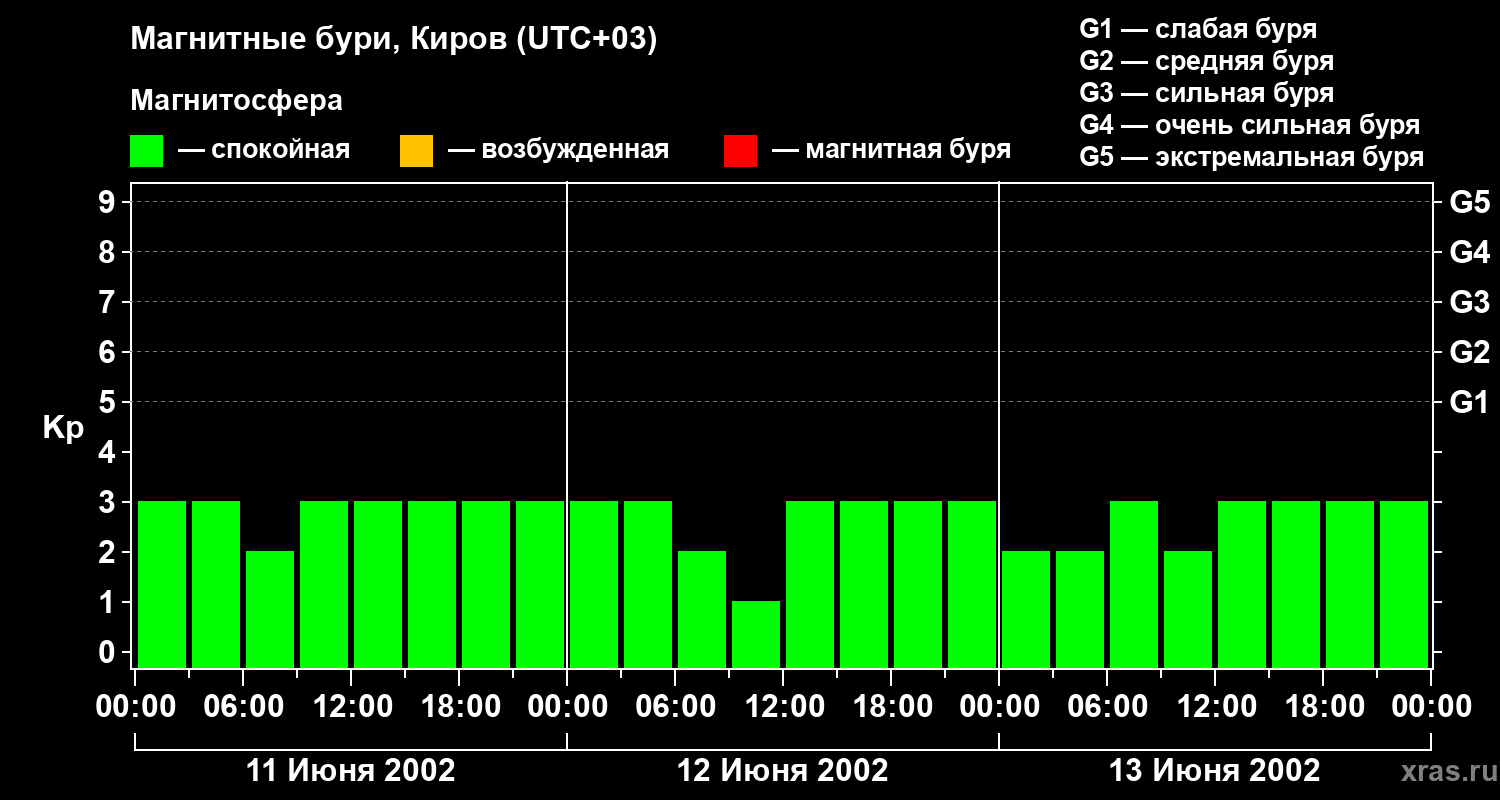Изменения геомагнитного индекса Kp с 11 по 13 июня 2002 года для средних широт