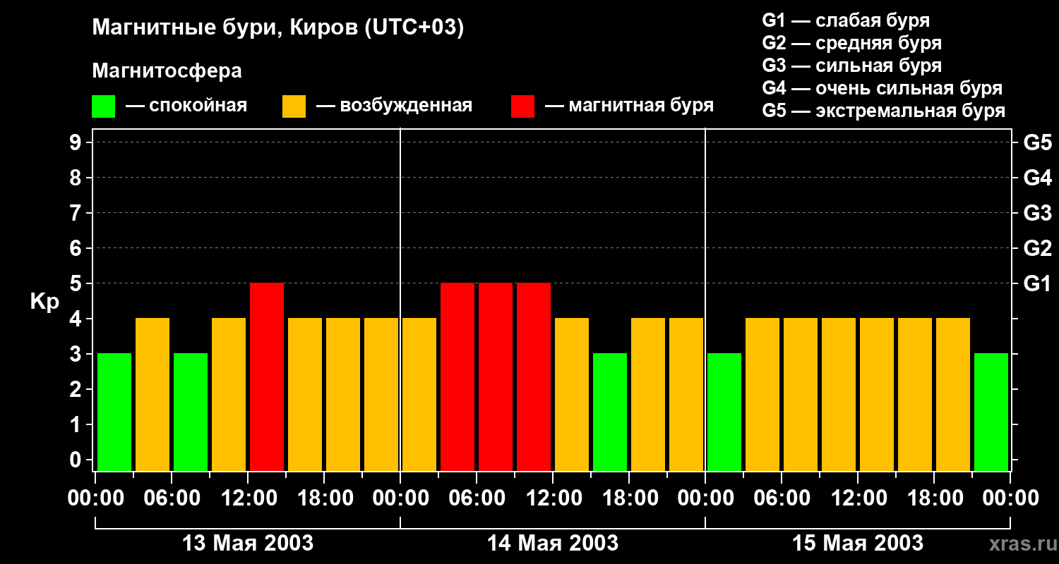 Изменения геомагнитного индекса Kp с 13 по 15 мая 2003 года для средних широт