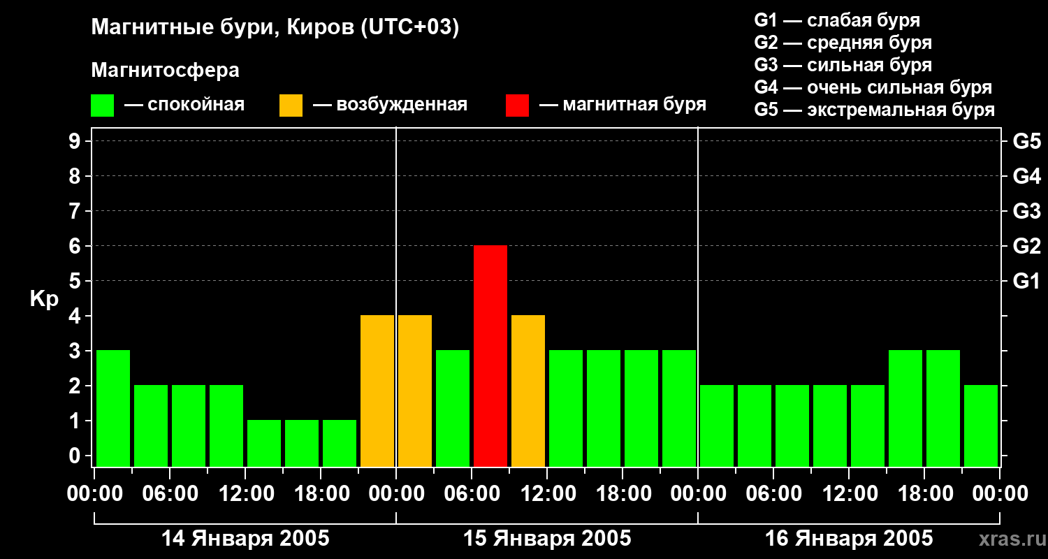 Изменения геомагнитного индекса Kp с 14 по 16 января 2005 года для средних широт