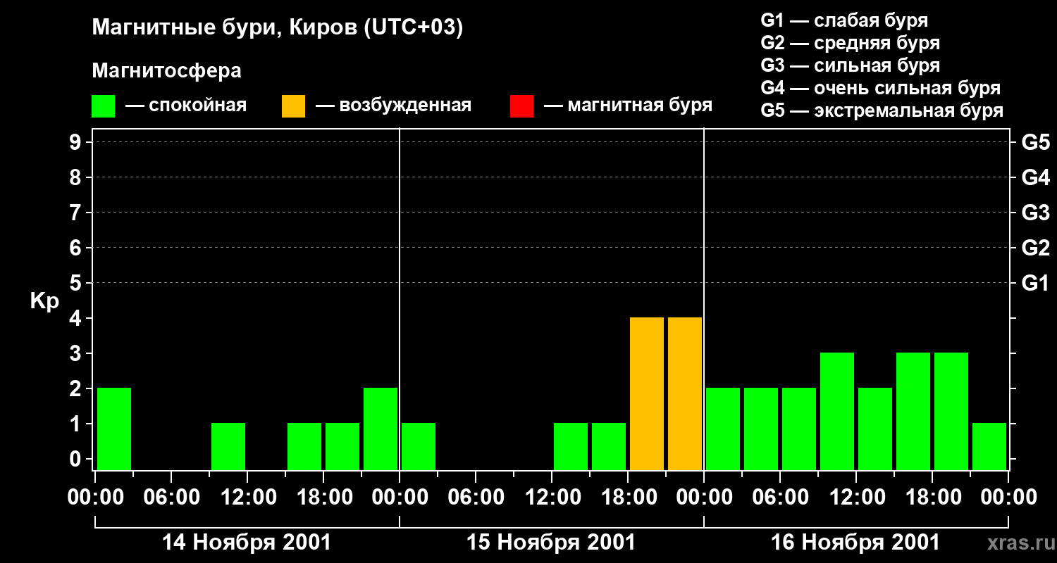 Изменения геомагнитного индекса Kp с 14 по 16 ноября 2001 года для средних широт