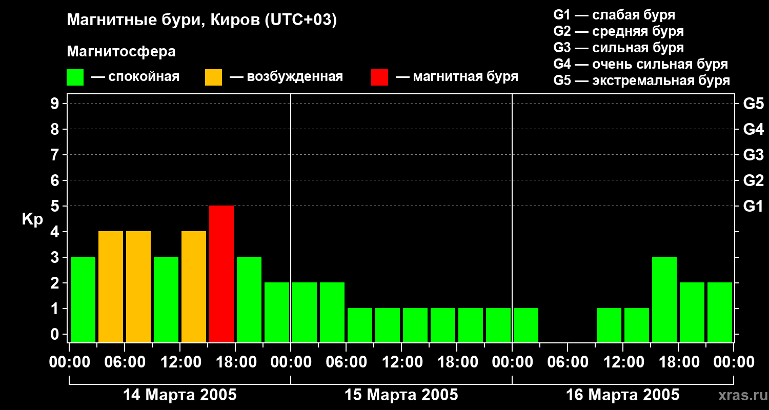Изменения геомагнитного индекса Kp с 14 по 16 марта 2005 года для средних широт