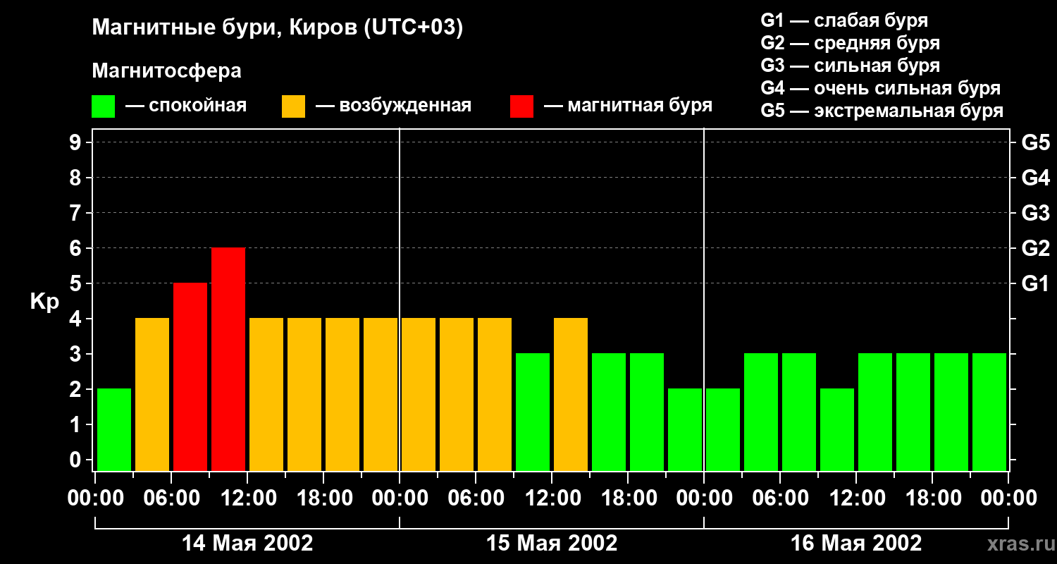 Изменения геомагнитного индекса Kp с 14 по 16 мая 2002 года для средних широт