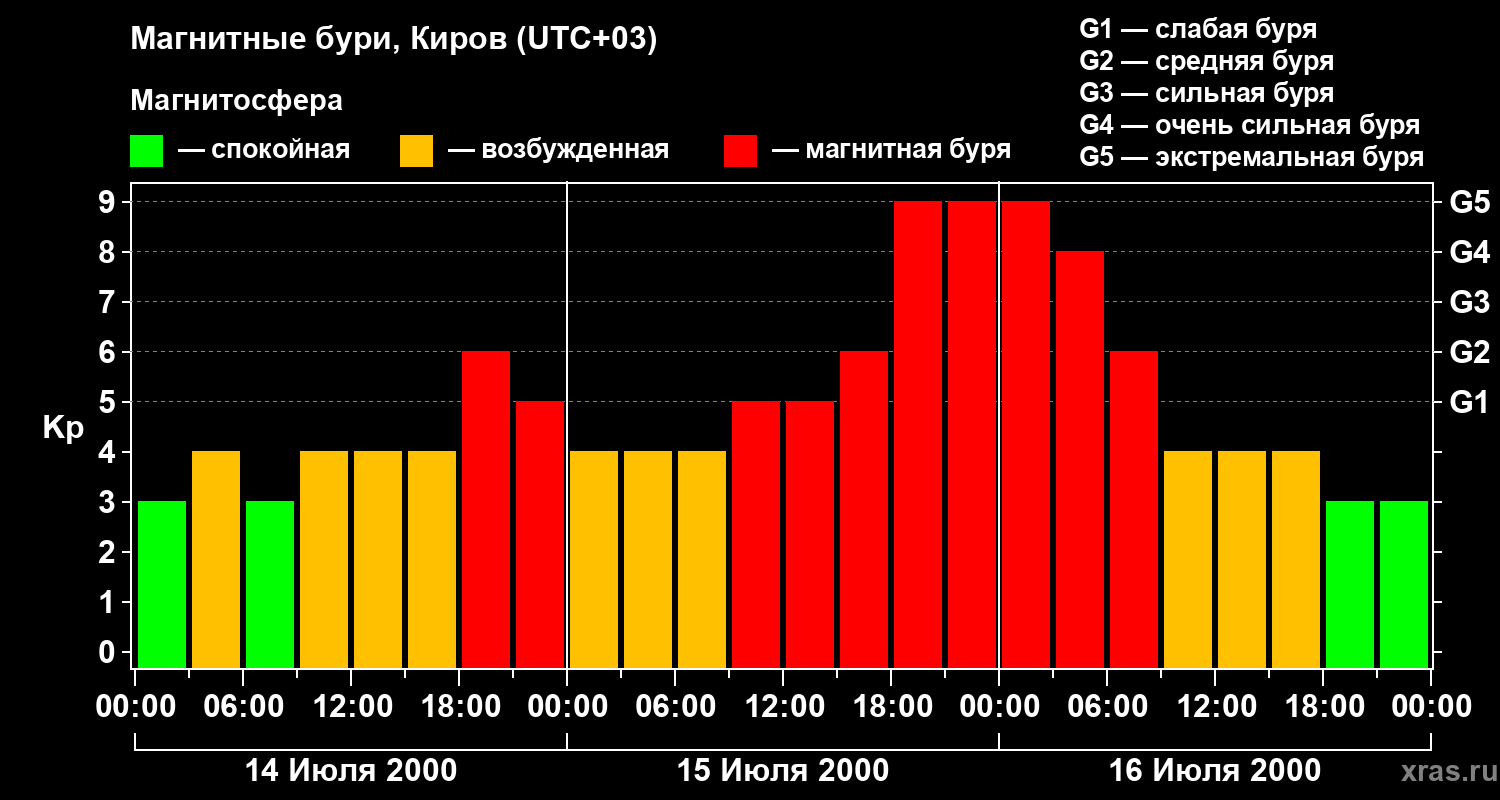 Изменения геомагнитного индекса Kp с 14 по 16 июля 2000 года для средних широт