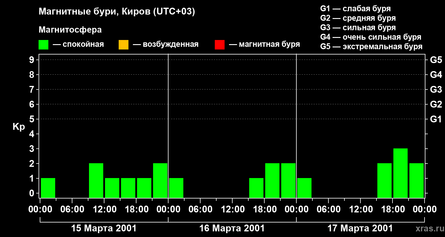 Изменения геомагнитного индекса Kp с 15 по 17 марта 2001 года для средних широт