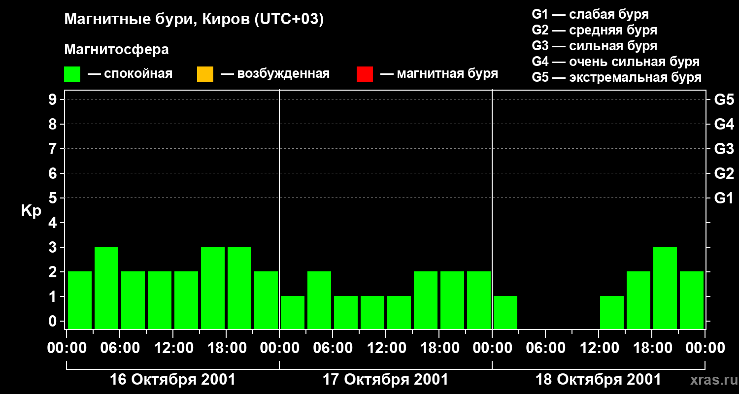 Изменения геомагнитного индекса Kp с 16 по 18 октября 2001 года для средних широт